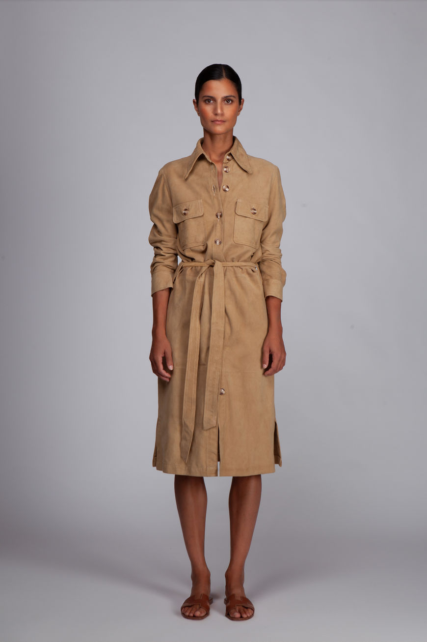 Out-of-Africa style shirtwaister in softest natural beige suede. The deep collar can be worn loosely open or closely buttoned. Side-slit skirt for easy lounging. Safari-style patch pockets and casual tie belt
