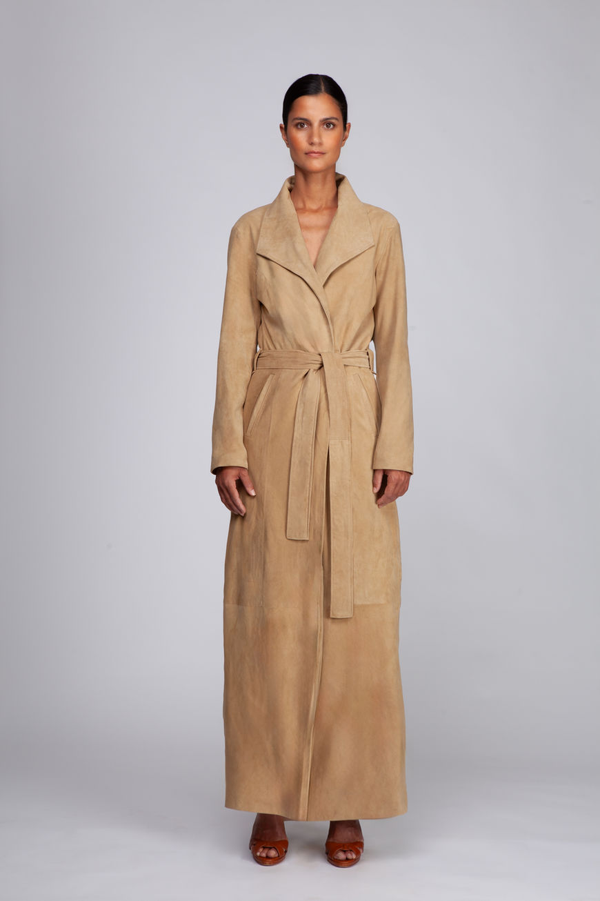 Body-skimming softest suede floor-length maxi-coat with wide lapels and casual tie belt. Perfect for slipping over a formal evening gown or relaxed lounging by an open fire. Alternatively worn as a coat dress on a cool summer evening...
